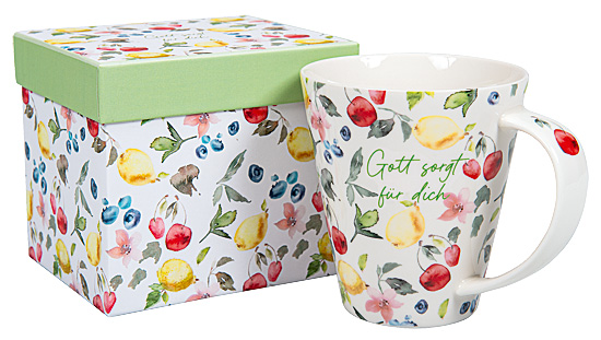 Mit dem frischen Früchtedesign und Aufdruck " Gott sorg für dich" zaubert diese Tasse aus Porzellan gleich einen guten Start in den Morgen. Ein Geschenk für viele Gelegenheiten, wie Muttertag, Geburtstag, Danke sagen..., Sie ist spülmaschinenfest und kommt in einer schönen dazu passenden Geschenkbox.