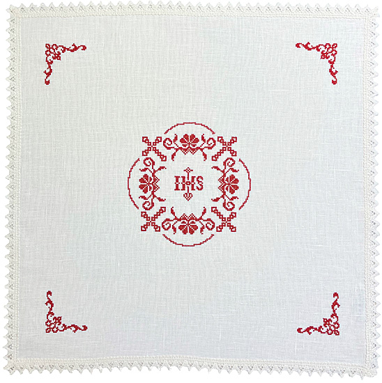 Osterweihdecke bestickt für die Speisenweihe in der Osternacht oder als Mitteldecke für Ihren Ostertisch, mit Spitzenborte verziert, waschbar.