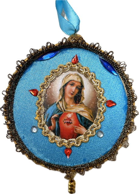 In traditioneller Klosterhandwerkskunst ist dieser Anhänger zu Ehren der Mutter Gottes gefertigt. Durchmesser 7 cm